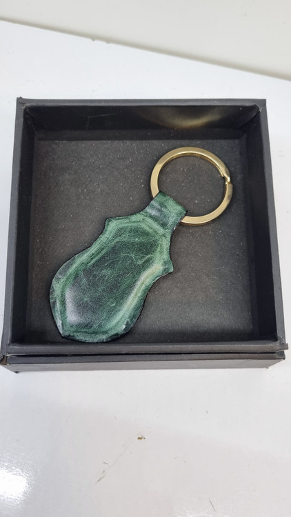<<جاکلیدی چرمی دستدوز از چرم گاوی طبیعی، با رنگ خاص سبز پتینهای و حلقه فلزی طلایی.
